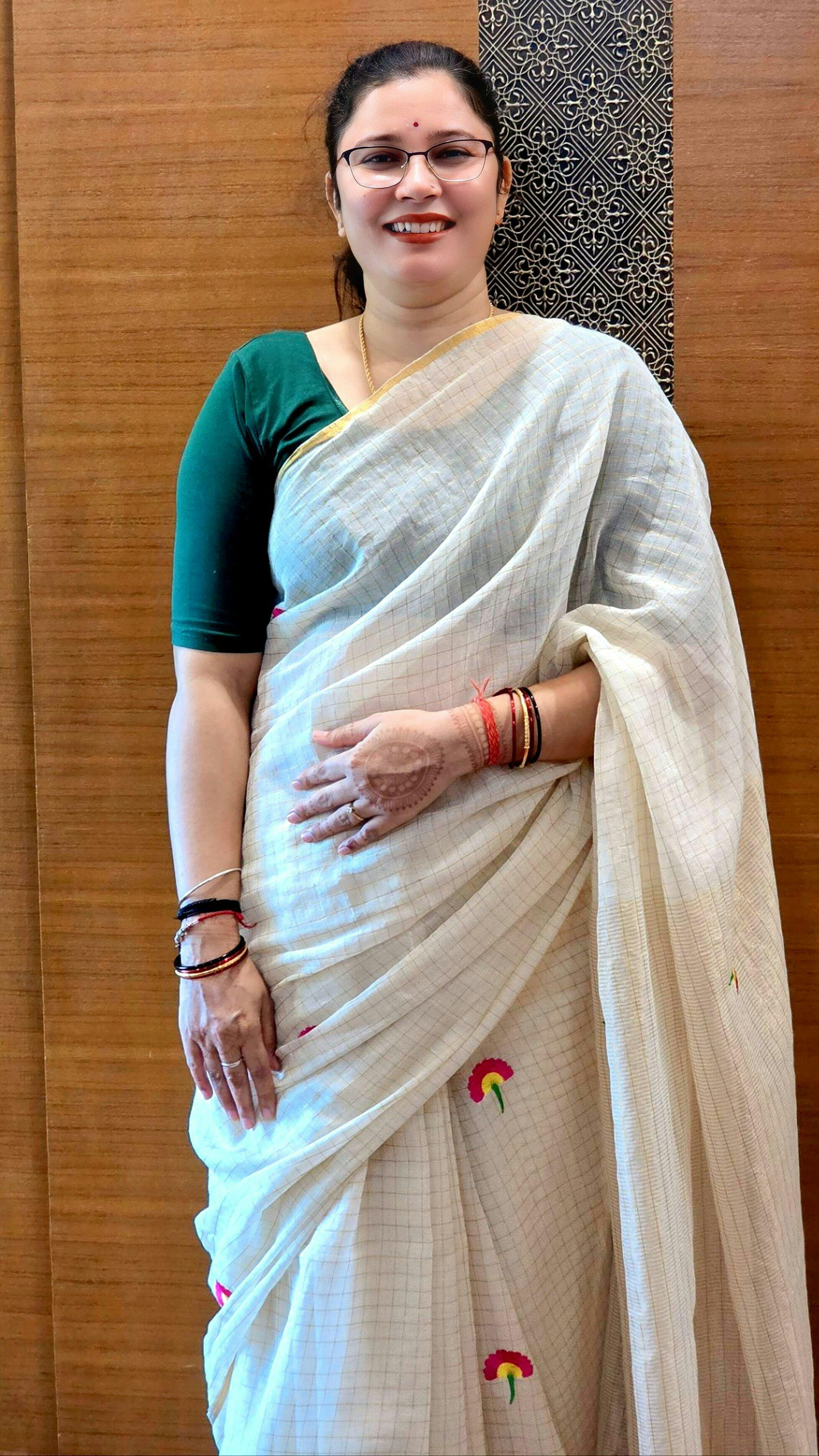 Noor | Off White Gold Mul Mul Cotton Saree with Flower Motif